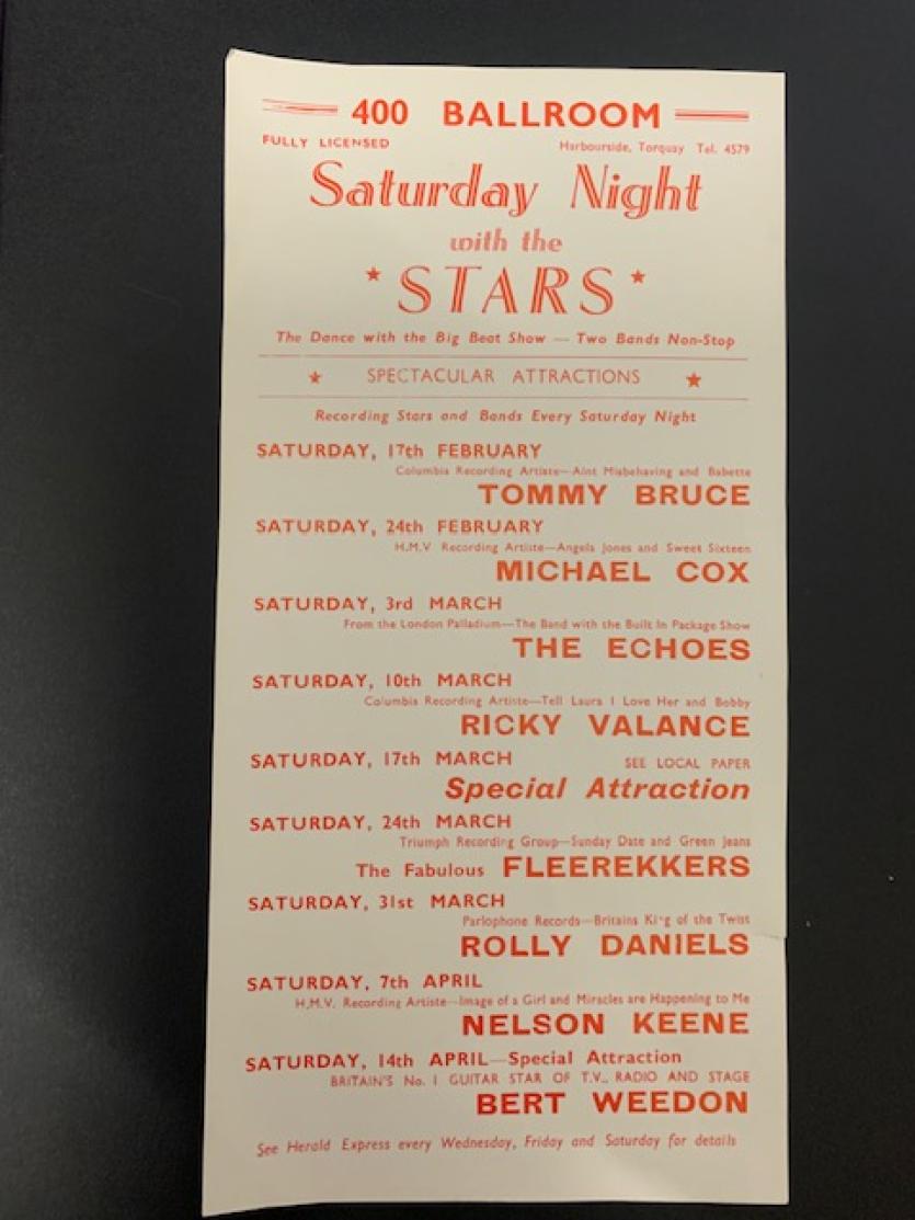With the local Co-Op Hall closing on a Saturday night due to a fire there, the Saturday night dances were moved to the 400 ballroom. I did a deal with the 400 management who were having poor attendance with the usual dance bands, so I booked in artists who were having chart success at the time; such as Ricky Valance with Tell Laura I love her, a number one top 20 hit, and Tommy Bruce, Bert Weedon, and others with top 20 hits.
