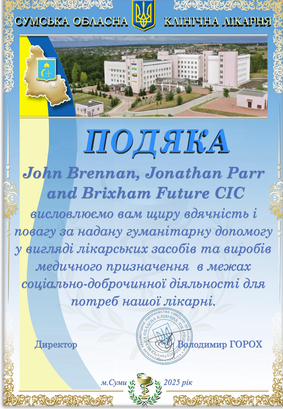 Director Volodymyr Horokh of Sumy Clinical Hospital said: “We express our sincere gratitude and respect for the humanitarian aid provided in the form of medicines and medical supplies as part of your social welfare activities for the needs of our hospital.”