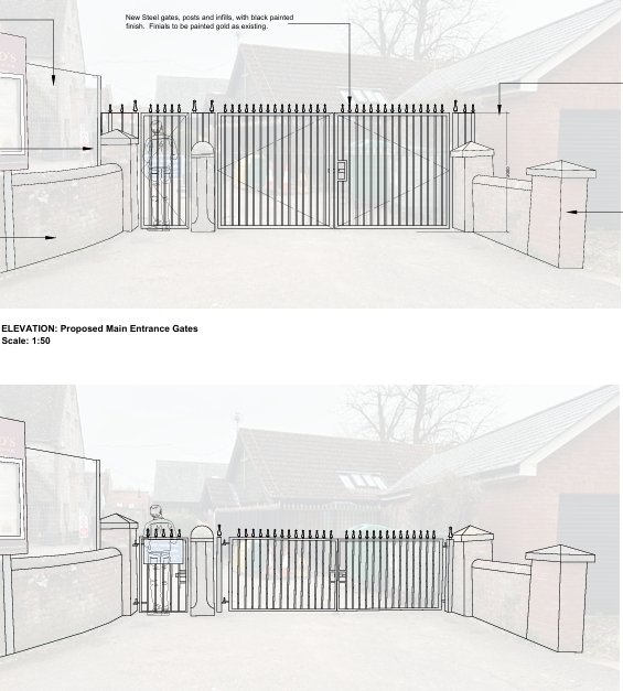The plans, drawn up by Devon-based firm Noved Consulting, show that the current modern steel gates would be replaced with new steel gates of a matching design, but increased to 2 metres in height.