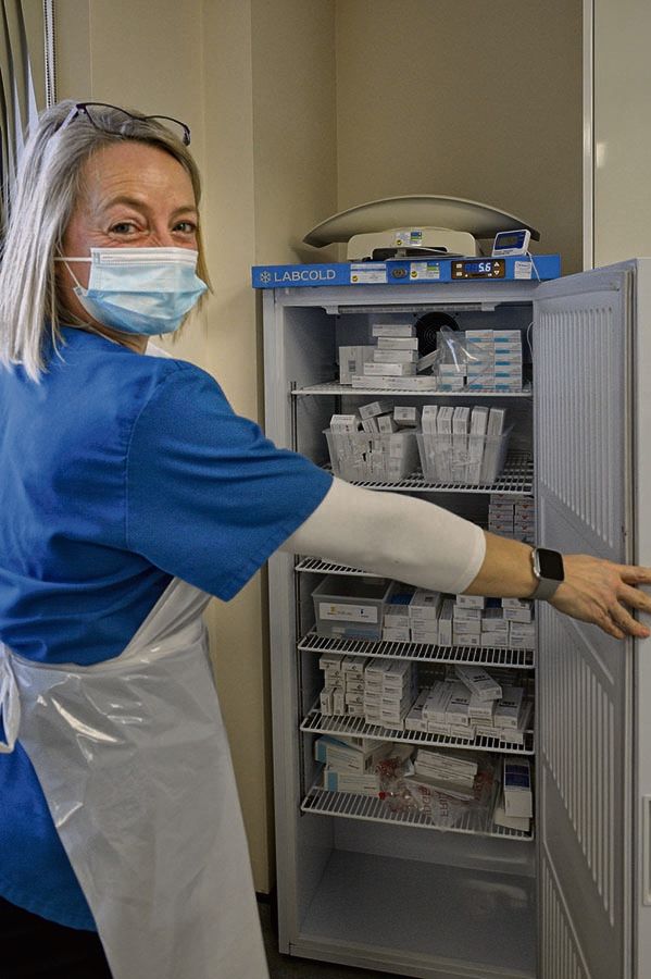 The Pfizer vaccine is normally delivered to designated sites in vials in thermally insulated packaging, but once stored locally at normal temperatures of 2-8C it can have a shelf-life of only three and a half days depending on when it is delivered. Each vial contains the equivalent of five doses, but as Pip Rubbra, Nurse Partner and Nursing Team Manager at Okehampton Medical Centre explained, when vaccinations started on a national basis it was quickly realised that each vial contained sufficient serum for six doses. Once the Pfizer vials are out of the refrigerator, they have to thaw and be made up with saline solution ready for vaccination within two hours, and then used within six hours – and that is when the pressure starts, to ensure that every single dose taken from the refrigerator is used, without any wastage, before it becomes time-expired. Although the AstraZeneca vaccine has a longer shelf life of six months, there is still the urgency to administer as many vaccinations as possible as quickly as possible, hence all vaccination centres. have compiled reserve lists of key workers and additional patients who are either classed as vulnerable or in qualifying cohorts, who can be available at short notice to come in for their vaccination – sometimes with as little as 20 minutes notice, in order to use up every available vaccination to avoid any wastage.