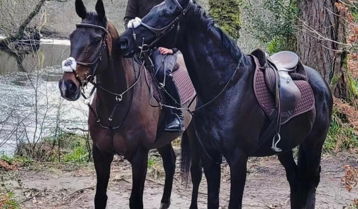 Bryony riding Frodon with Black Corton besides the River Dart. Credit: Bryony Frost