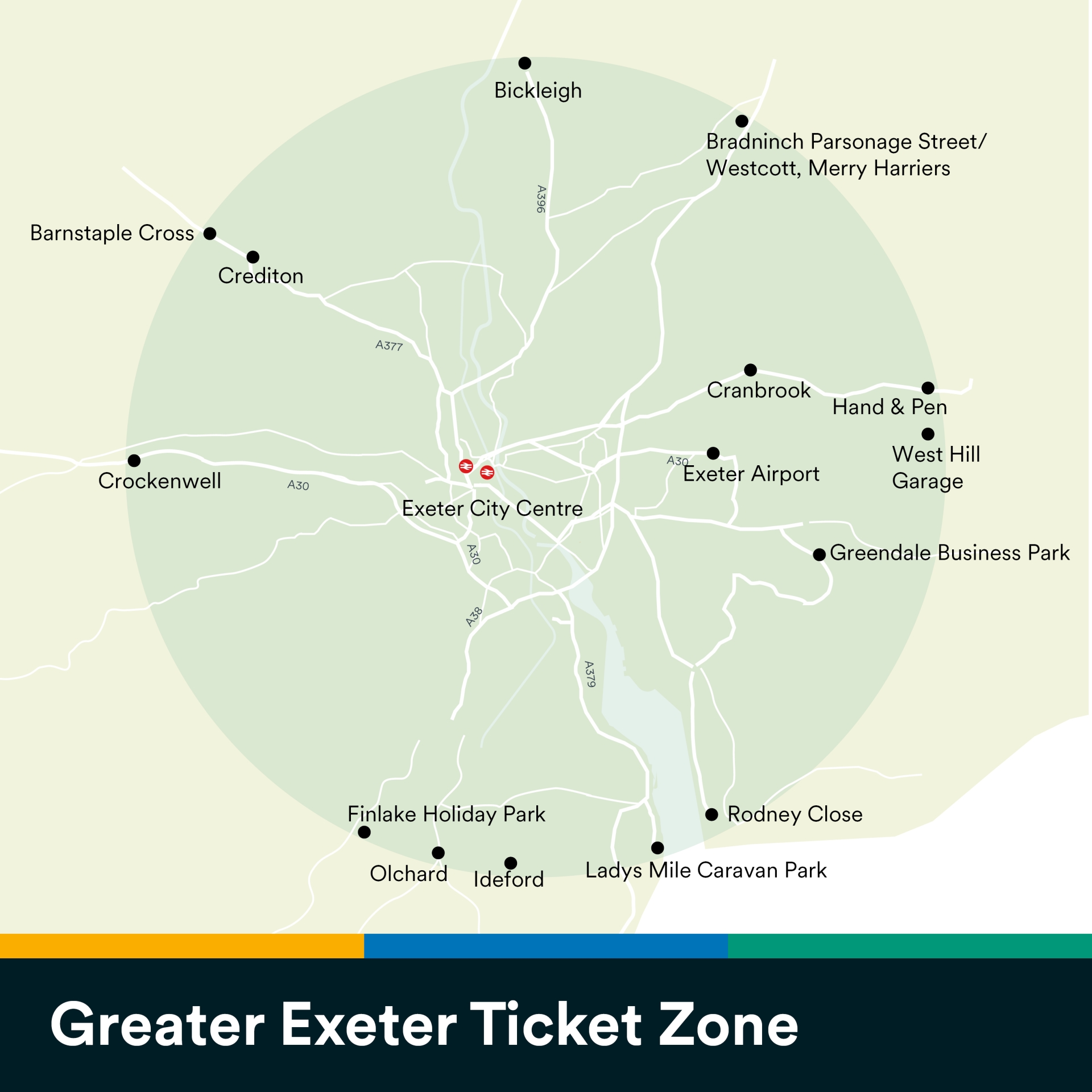 Greater Exeter Zone - covering places such as Crediton, Bickleigh, Crockernwell, Barnstaple Cross, West Hill, Greendale, Finlake Holiday Park, Ide, Ideford, and areas as far as Dawlish and Exeter Airport.