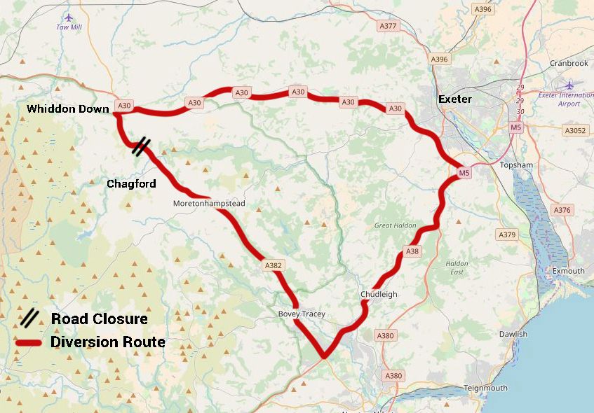 A notification has now been placed at the site which states that the road will be closed from 19th – 29th June and since Highways must place diversions on roads with the same classification (ie A roads) the diversion route will be via the A382, A38, A30 A382 and vice versa. This would mean a diversion of nearly 40 miles. A resident who lives on the stretch of road where the repairs will take place said that access to his property is granted so the closure wouldn’t affect his travel to and from home, but also confirmed that he had spoken to the contractor and had been informed that the culvert wasn’t going to be replaced as originally thought, it is going to be cleared of all sediment and the capstone replaced.